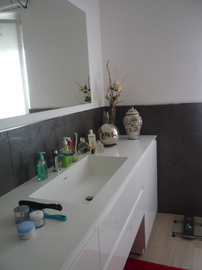 La lucidissima laccatura poliestere accostata al tono più opaco del Corian dona un’elegante sfumatura di colori.
