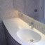 Nascondiamo la lavatrice stondando il lavabo in modo da agevolare il passaggio con una forma morbida.